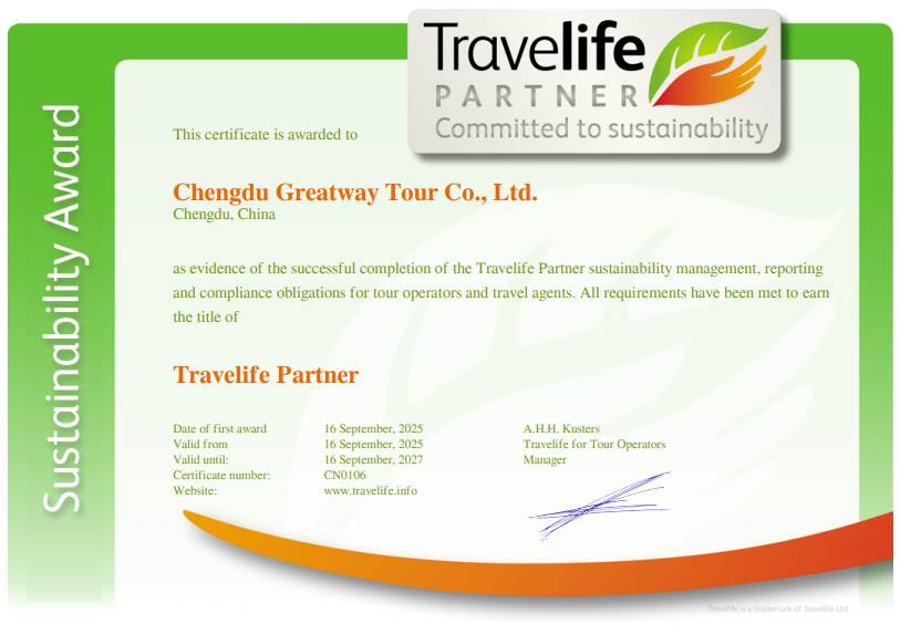 Our team Chengdu Greatway Tour has got the Travelife Partner award which is a recognition of our commitment towards social and environmental sustainability. We comply with more than 100 criteria related to sustainability management, office operations, working with suppliers and customer communication. We are working towards further improvements aiming to eventually reach the Travelife Certified stage.